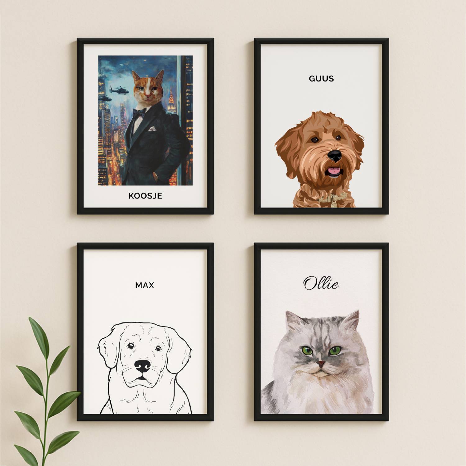 Kies het portret dat bij jouw huisdier past en upload een duidelijke foto. Je kunt ook de naam en eventuele wensen doorgeven.