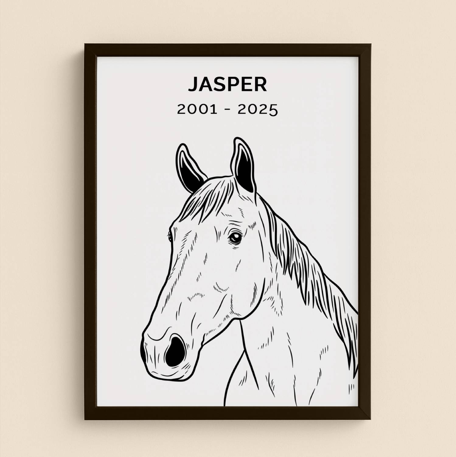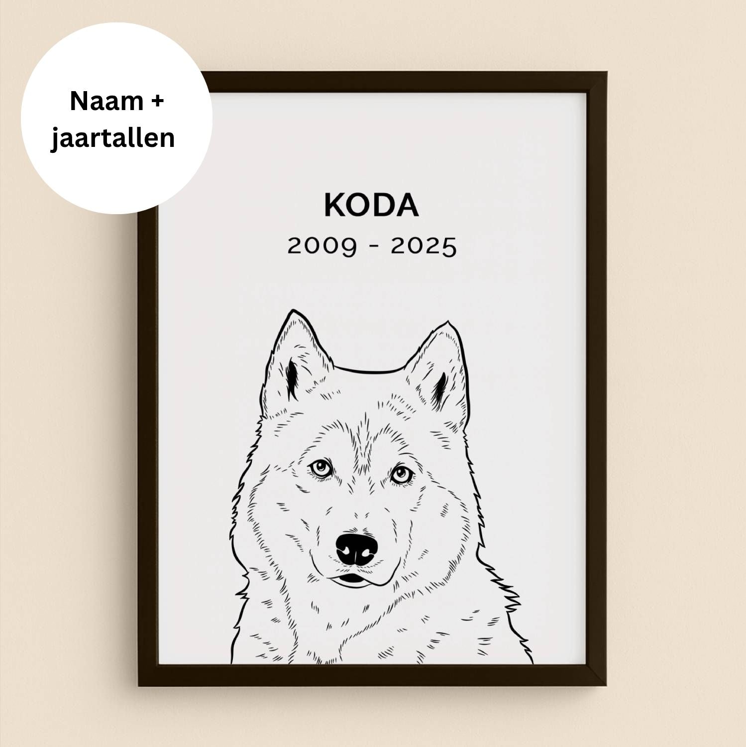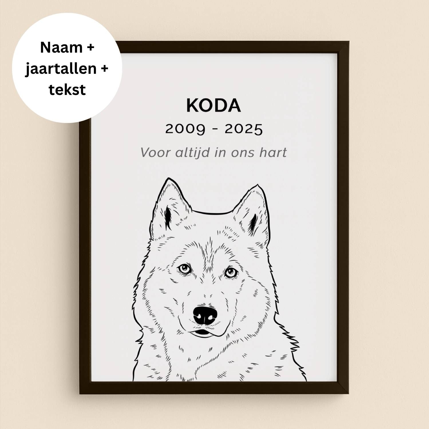 🕊️ Maak je portret persoonlijk met een naam, jaartallen of korte tekst (optioneel).